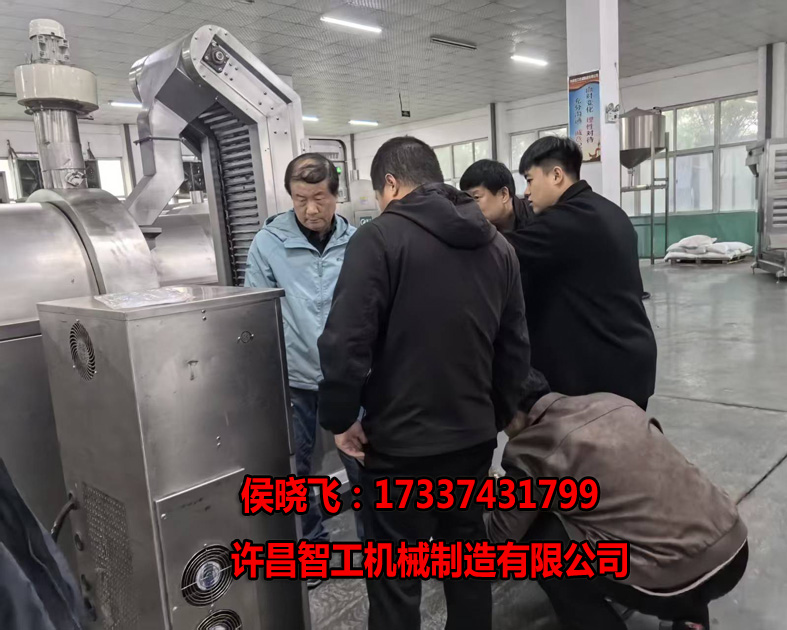 11.14日,许昌智工迎来一波特殊的国外客户,客户是来自韩国的大叔,漂洋过海来到我们智工厂家试机小型膨化线炒制虾条虾片!!!···